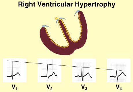 Ventricular hypertrophy: The next step is to look at the QRS complexes in V1-V6. If you have a reversal in R-wave progression and right axis deviation, then you may be looking at right ventricular hypertrophy. What seals the deal here is to also look at the QRS in V1, and if the height of the R wave is equal to or greater than the depth of the S wave, you have right ventricular hypertrophy. The last step is to evaluate the EKG for left ventricular hypertrophy. This is more tricky than the other abnormalities. There are three general guidelines to diagnose left ventricular hypertrophy: R wave height in AVL > 11 mm, R wave height in Lead I plus the S wave depth in Lead III that exceeds 25 mm, and, the most common, S wave depth in V1 plus the height in V5 that exceeds 35 mm. If you see one of these, you may have left ventricular hypertrophy. You may also see left axis deviation, but it is not needed for diagnosis. However, right axis deviation is needed for diagnosing right ventricular hypertrophy.