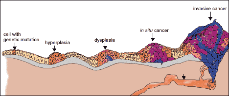 The genetic mutations accumulated by cancer cells allow the cells to proliferate indefinitely, evade cell death and eventually invade other tissues. Although there are several types of cancer, each staged according to specific diagnostic criteria, many cancers have similar steps of disease progression. All of the cells produced by division of this first, ancestral cell and its progeny also display inappropriate proliferation. A tumor, or mass of cells, formed of these abnormal cells may remain within the tissue in which it originated (a condition called in situ cancer), or it may begin to invade nearby tissues (a condition called invasive cancer). An invasive tumor is said to be malignant, and cells shed into the blood or lymph from a malignant tumor are likely to establish new tumors (metastases) throughout the body.