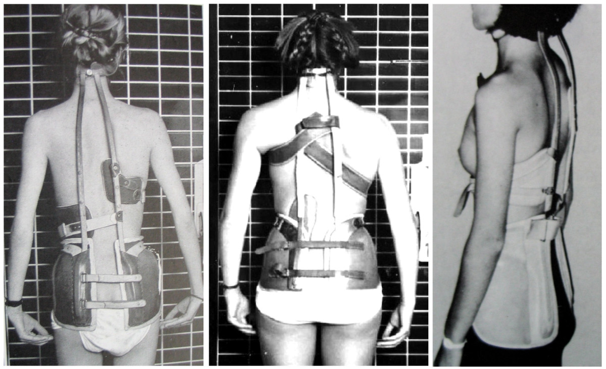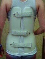 This type of brace have a neck ring and flat bar in front and at the back. Though the design is somewhat awkward, this is effective in correcting the curve of the spine.