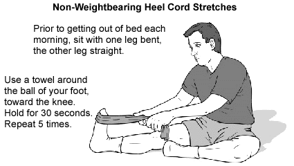 Stretch between warming up and exercising, and then again after exercising. Although there is some controversy about the value of stretching, many professionals believe that stretching helps prevent injury and that flexibility is a key component of fitness. Stretch the back, hip, thigh, and calf muscles. Tightness in one can lead to undue strain and tightness on the others.Pay particular attention to stretching the calf muscles because they are directly connected to the Achilles tendon. Stretching can be done lying down, sitting, or standing, and without any equipment.However, some stretches are easier to do with an elastic band pull, when leaning against a wall or on an inclined surface. Stretches are usually named after the muscle being stretched, i.e., gastroc (gastrocnemius) stretches and soleus stretches for the calf muscles. Stretch gently and slowly. Hold each stretch for half a minute to a minute.