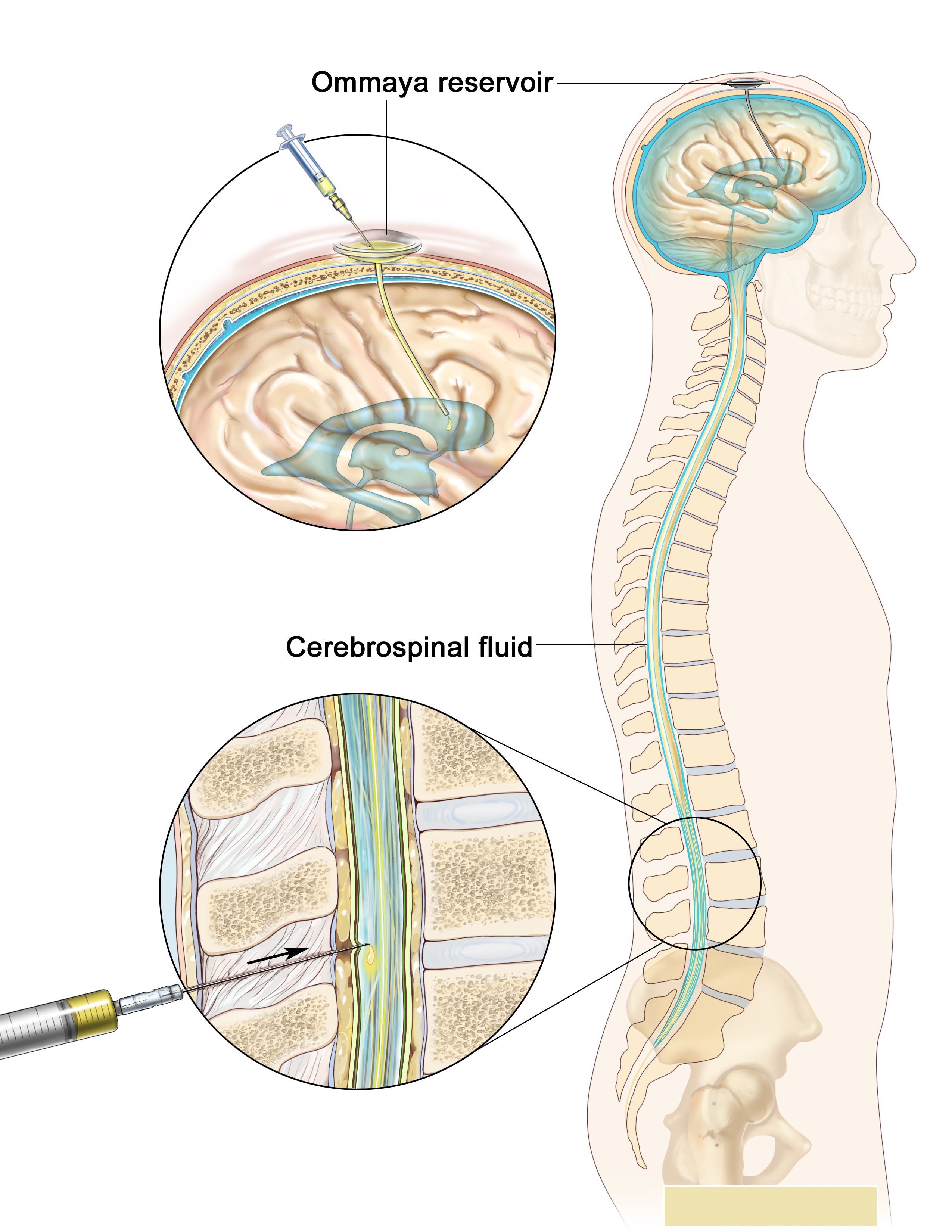 | Consolidation/Intensification | Intensification uses high doses of intravenous multidrug chemotherapy to further reduce tumor burden. Since all cells sometimes penetrate the CNS, most protocols include delivery of chemotherapy into the CNS fluid (termed intrathecal chemotherapy). Some centers deliver the drug through Ommaya reservoir (a device surgically placed under the scalp and used to deliver drugs to the CNS fluid and to extract CNS fluid for various tests). Other centers would perform multiple lumbar punctures as needed for testing and treatment delivery. |