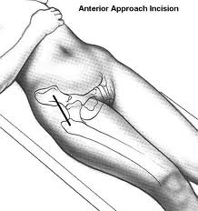 The Anterior Approach to hip replacement was first performed in Europe in 1947. Since that time, the technique has been continually refined with advancing medical technology. Today, literally thousands of hip replacement patients have benefited from this minimally invasive approach in Europe and America. This anterior approach follows the lower half of the interval of the Smith-Peterson approach, making it a true anterior approach to the hip. It should not be confused with the Harding approach, which is often referred to as an anterior approach, but involves a lateral incision.