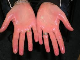 Hyperhidrosis may be also divided into palmoplantar (symptomatic sweating of primarily the hands or feet), gustatory and generalized hyperhidrosis.