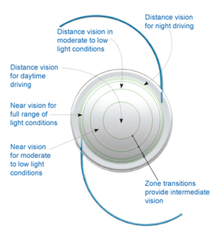 The multifocal intraocular lenses are ones of the newest types of such lenses. They are often referred to as “premium” lenses because they are multifocal and accommodative and allow the patient to visualize objects at more than one distance, removing the need to wear eyeglasses or contact lenses. Premium intraocular lenses are those used in correcting presbyopia or astigmatism. Premium intraocular lenses are typically not covered by insurance companies as their additional benefits are considered a luxury and not a medical necessity. An accommodative intraocular lens implant has only one focal point, but it acts as if it is a multifocal IOL. The intraocular lens was designed with a hinge similar to the mechanics of the eye’s natural lens.