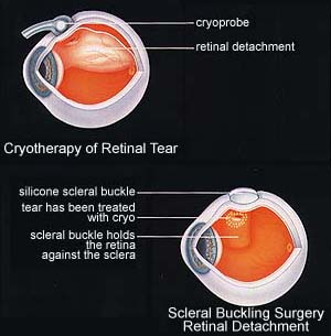 For some cases, other types of surgery for detached retina may be recommended. These procedures may be done in conjunction with photocoagulation or cryopexy. The type, size and location of the retinal detachment will determine which surgical approach your eye surgeon recommends. In general, these surgeries can successfully treat most cases of retinal detachment, although a second treatment is sometimes necessary. These surgeries include scleral buckling, vitrectomy, or pneumopexy.