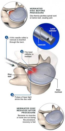 After sedation, a miniature endoscope with a laser fiber is carefully inserted into the disc while remaining outside the spinal canal. A laser is used to remove disc tissue near the herniated site in order to decompress the disc. The procedure takes approximately one hour. Success rates are seen in about 66 – 75% of all patients who have this procedure.