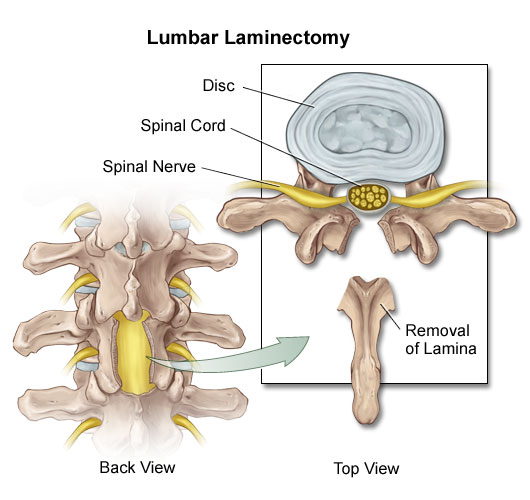 A lumbar laminectomy is a surgical procedure that is performed to alleviate pain caused by neural impingement. The laminectomy surgery is designed to remove a small portion of the bone over the nerve root and/or disc material from under the nerve root to give the nerve root more space and a better healing environment.