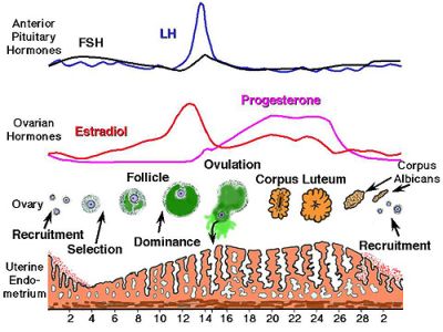 FSH stimulates the growth and recruitment of immature ovarian follicles in the ovary. In early (small) antral follicles, FSH is the major survival factor that rescues the small antral follicles (2–5 mm in diameter for humans) from apoptosis (programmed death of the somatic cells of the follicle and oocyte). In the luteal-follicle phase transition period the serum levels of progesterone and estrogen (primarily estradiol) decrease and no longer suppress the release of FSH, consequently FSH peaks at about day three (day one is the first day of menstrual flow). The cohort of small antral follicles is normally sufficiently in number to produce enough Inhibin B to lower FSH serum levels.