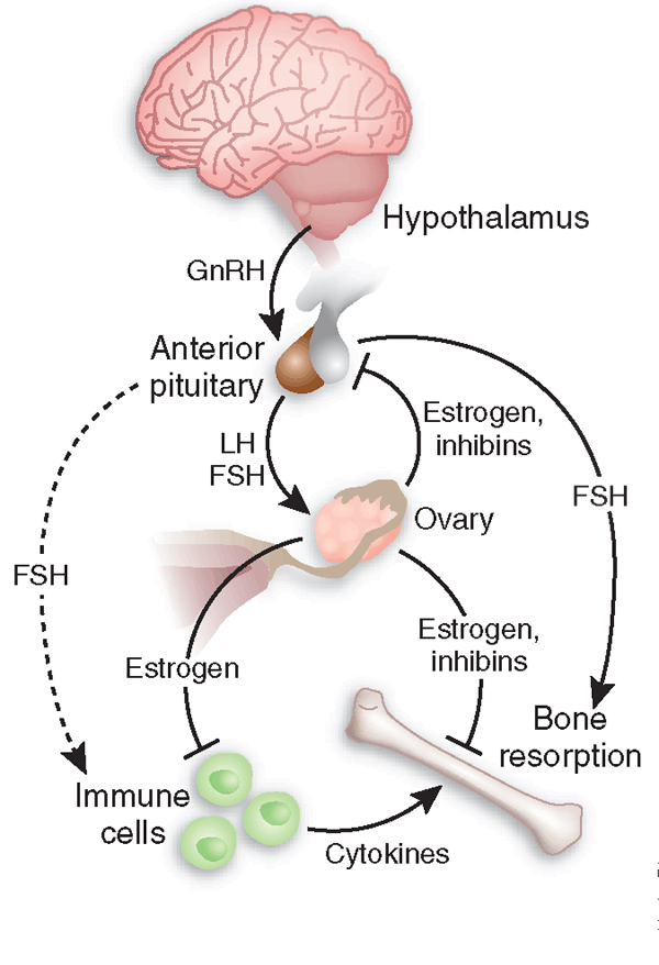 As a woman nears perimenopause, the number of small antral follicles recruited in each cycle diminishes and consequently insufficient Inhibin B is produced to fully lower follicle stimulating hormone (FSH) and the serum level of FSH begins to rise. Eventually the FSH level becomes so high that down regulation of FSH receptors occurs and by menopause any remaining small secondary follicles no longer have FSH receptors.