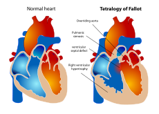 - Overriding aorta (the artery that carries oxygen-rich blood to the body) that is shifted over the right ventricle and ventricular septal defect, instead of coming out only from the left ventricle