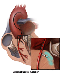 - Septal ablation treats abnormal thickening of heart muscle (hypertrophic cardiomyopathy). A doctor threads a catheter to the thickened heart tissue and delivers a small amount of alcohol that creates a mild heart attack. This ablation helps reduce the thickening in the heart and ease symptoms.